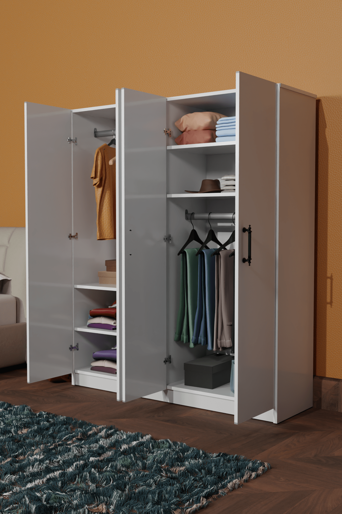 ARENA BEYAZ GARDIROP 4 KAPAKLI 2 ASKILIKLI, 6 RAFLI DOLAP ; YxGxD = 172x121x44 ; Ürünlerimiz 18 mm kalınlığında suntalamdır, piyasadaki bazı ürünler gibi 16 mm değildir.; ; Kurulumda ihtiyaç duyacağınız tüm hırdavat malzemeleri ürünle beraber gönderilmektedir.; Tüm delikleri delinmiştir.; ; Ürünümüzün parça numaraları üzerinde yer almaktadır.; Kurulum şeması/Kurulum videosundan bakarak kurulumunu yapabilirsiniz.; ; Kullanılan suntalarımız E1 Kalite standardına uygundur.; Kanserojen madde içermemektedir.; ; Çift askılık ve 6 raf sayesinde daha verimli kullanış içermektedir.; ; Her hangi bir olumsuz durumda (Hasar/Eksik Parça/Kurulumla ilgili sorun) tarafımızla iletişime geçebilirsiniz.; Bedelsiz yedek parça desteği sağlanmaktadır.; ; 2 yıl ürün garantimiz mevcuttur.; ; Kanunen kurulumu yapılmış ürünlerin iadesi yeniden satışa uygun olmadığı için mümkün değildir.; ; Ürünler demonte olarak gönderilmektedir.; ;