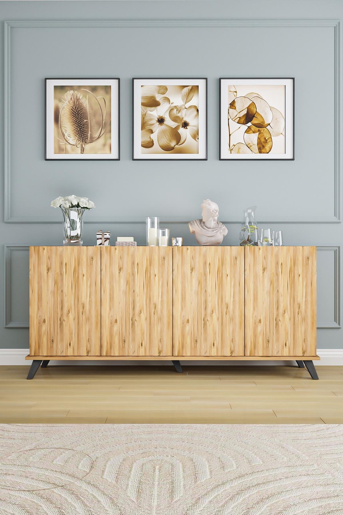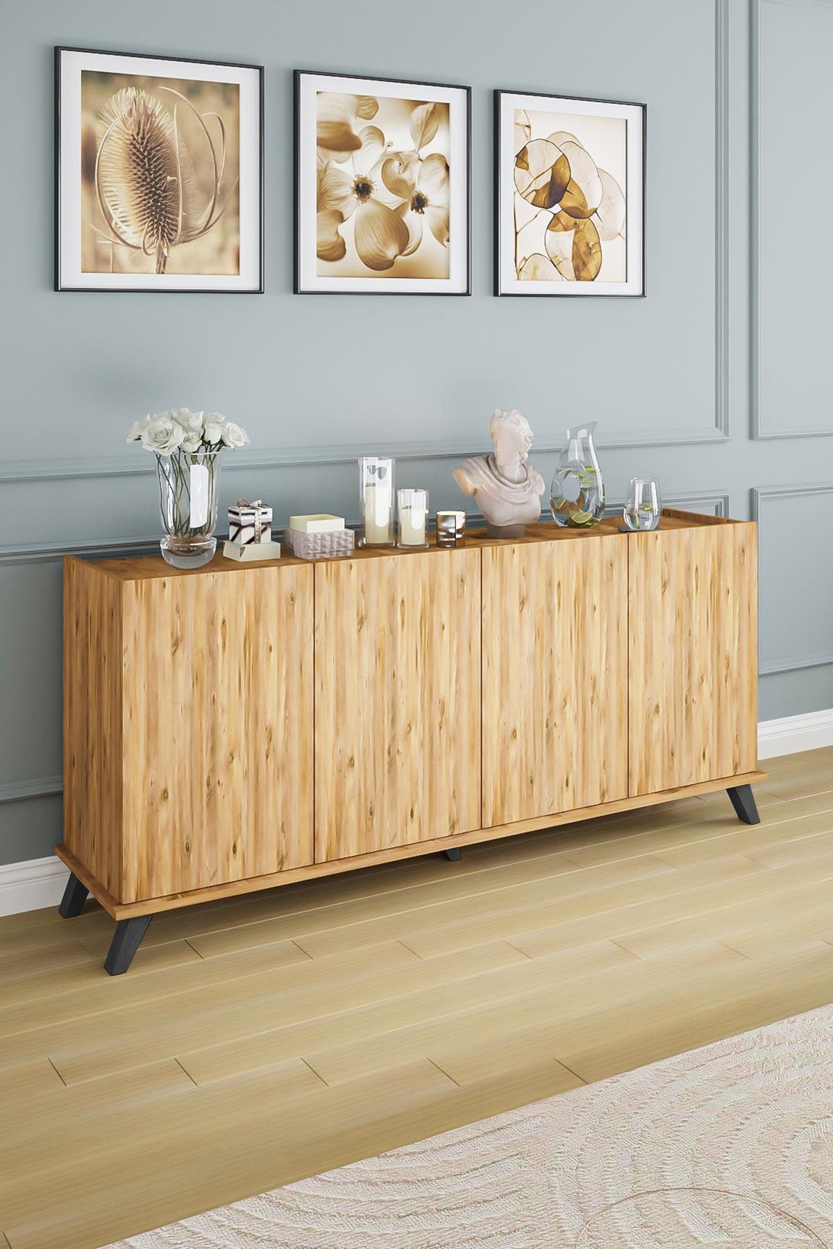 AE-2056 AKEL Atlantik Çam 4 KAPAKLI GENİŞ KONSOL 180 CM AYAKLIRAFLI YEMEK ODASI TV SEHBASI,