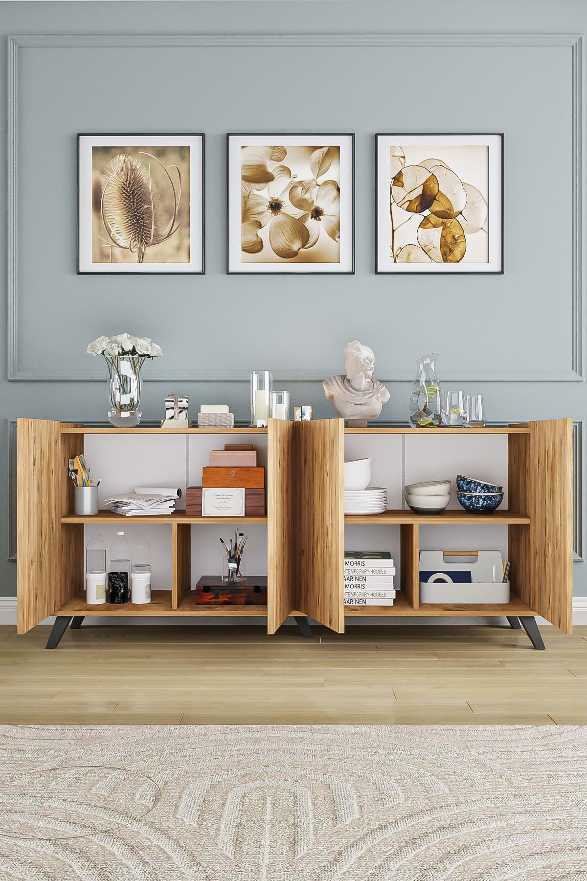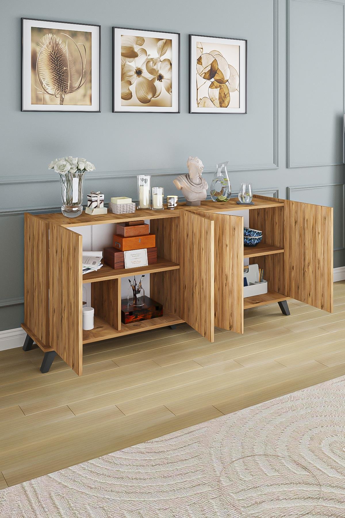 AE-2056 AKEL Atlantik Çam 4 KAPAKLI GENİŞ KONSOL 180 CM AYAKLI,RAFLI, YEMEK ODASI, TV SEHBASI
