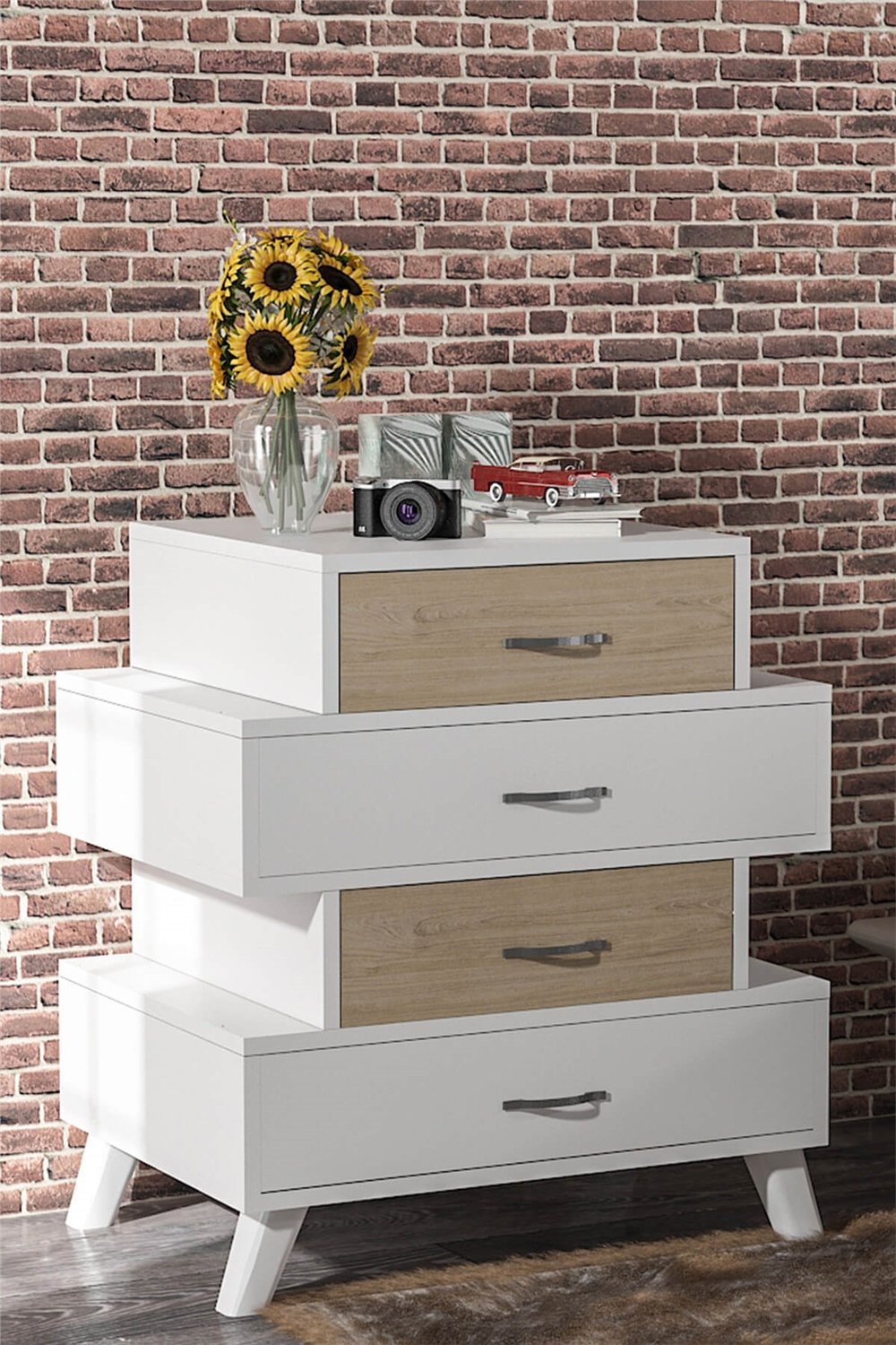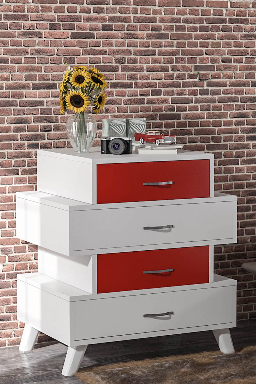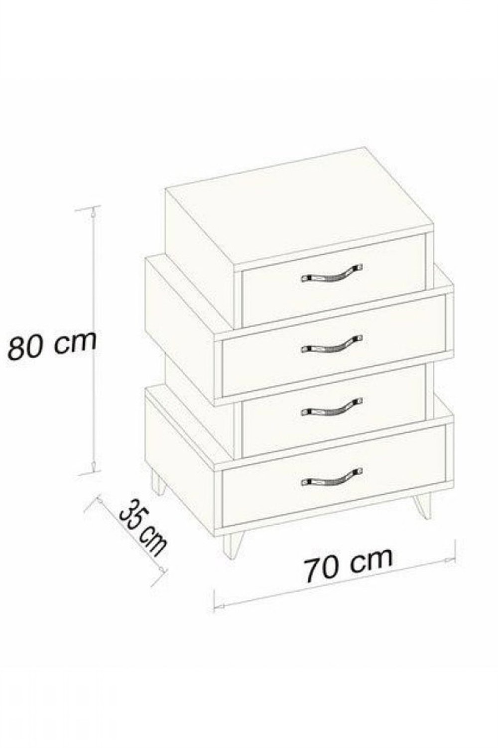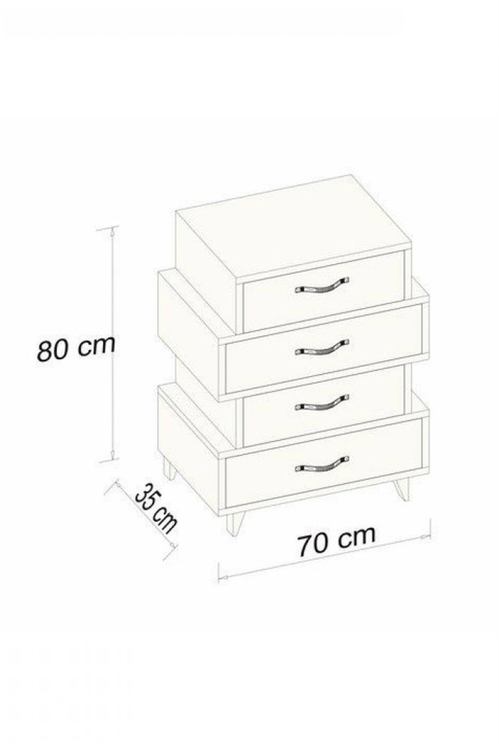 • Yükseklik: 80 cm ; Genişlik: 70 cm ; Derinlik: 35 cm • 4 Çekmeceli • Ürünümüz Avrupa E1 Kalite standartlarında, Çevre ve çocuk sağlığına uygun malzemeler kullanılarak üretilmiştir. • Ürünümüzde 18 mm. kalınlığında Parlak Beyaz 1. sınıf melamin kaplı yonga levha kullanılmıştır. • Ürünümüzde kenar bantları 0,40 mm. PVC bant kullanılarak üretilmiştir. • Ürünlerimiz demonte şekilde gönderilmektedir. • Ürün montajı Alyan vida sistemi ile yapılmaktadır. • Ürünlerinizde defalarca söküp tekrar kurulum sağlayabilirsiniz, ürünlerinizi farklı mekânlara taşıyabilirsiniz. • Montaj kutunuzun içerisinde her türlü bağlantı aparatınız ve kurulum şemanız bulunmaktadır, kullanacağınız vida ve diğer ekipmanlar ayrı ayrı paketlenerek isimlendirilmiştir. • Ürün parçalarına rahat montaj yapabilmeniz için kurulum şeması ile uyumlu numaralar verilmiştir.