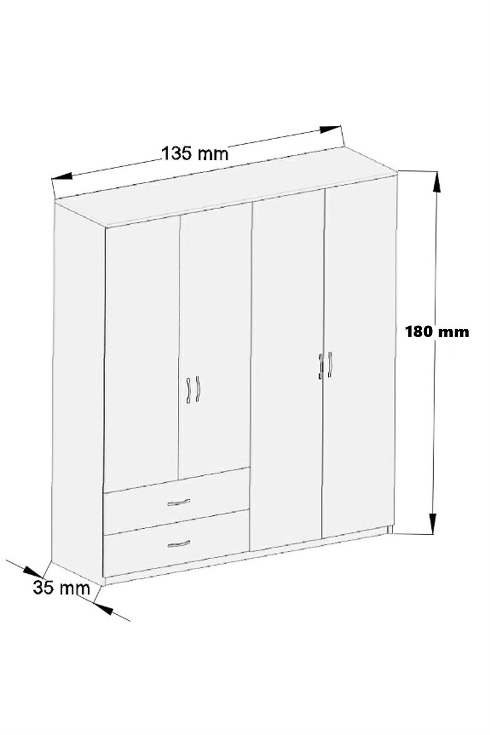 • Yükseklik: 180 cm ; Genişlik: 135 cm ; Derinlik: 35 cm • Ürünümüz Avrupa E1 Kalite standartlarında, Çevre ve çocuk sağlığına uygun malzemeler kullanılarak üretilmiştir. • Ürünümüzde 18 mm. kalınlığında Parlak Beyaz 1. sınıf melamin kaplı yonga levha kullanılmıştır. • Ürünümüzde kenar bantları 0,40 mm. PVC bant kullanılarak üretilmiştir. • Ürünümüz özel kutularında demonte olarak sizlere gönderilir. • Kurulum müşteriye aittir. • Ürün montajı Alyan vida sistemi ile yapılmaktadır. • Ürünlerinizde defalarca söküp tekrar kurulum sağlayabilirsiniz, ürünlerinizi farklı mekânlara taşıyabilirsiniz. • Montaj kutunuzun içerisinde her türlü bağlantı aparatınız ve kurulum şemanız bulunmaktadır. • Kullanacağınız vida ve diğer ekipmanlar ayrı ayrı paketlenerek isimlendirilmiştir. • Ürün parçalarına rahat montaj yapabilmeniz için kurulum şeması ile uyumlu numaralar verilmiştir.